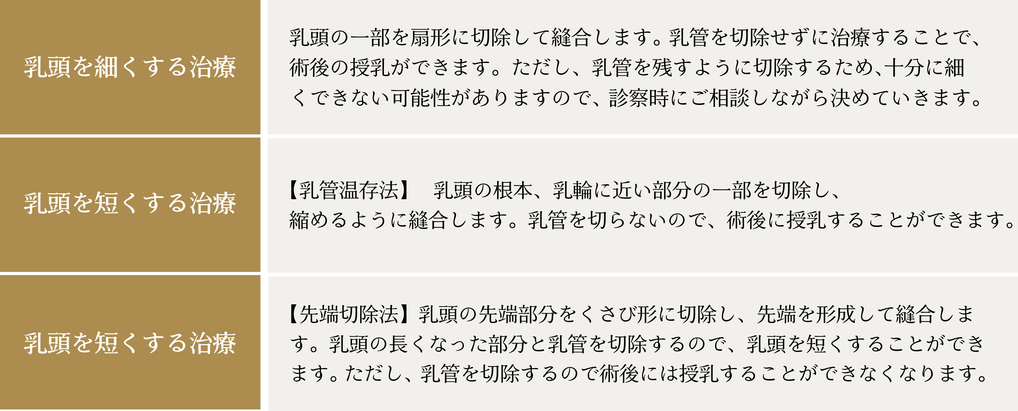 乳頭を縮⼩する治療には、乳頭の直径を細くする⽅法、乳頭の⻑さを短くする⽅法、など外⾒についての違いや、⼿術後にも授乳できるようにする⽅法、⼿術後の授乳は考慮しない⽅法など、乳頭の機能についての違いなど、いくつかの⼿術⽅法があります。 実際には医師がご希望をお伺いし、状態を診察させていただいた上で、最適な⽅法をご提案いたします。